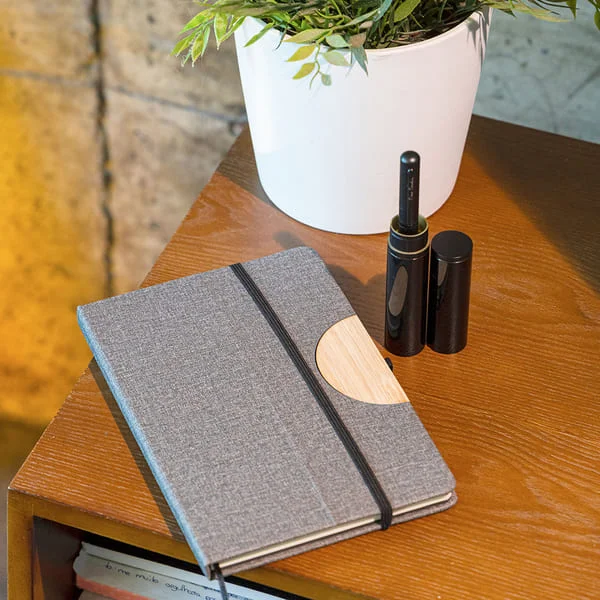 Bloco A5 em linho, com detalhe em bambu para suporte de telemóvel