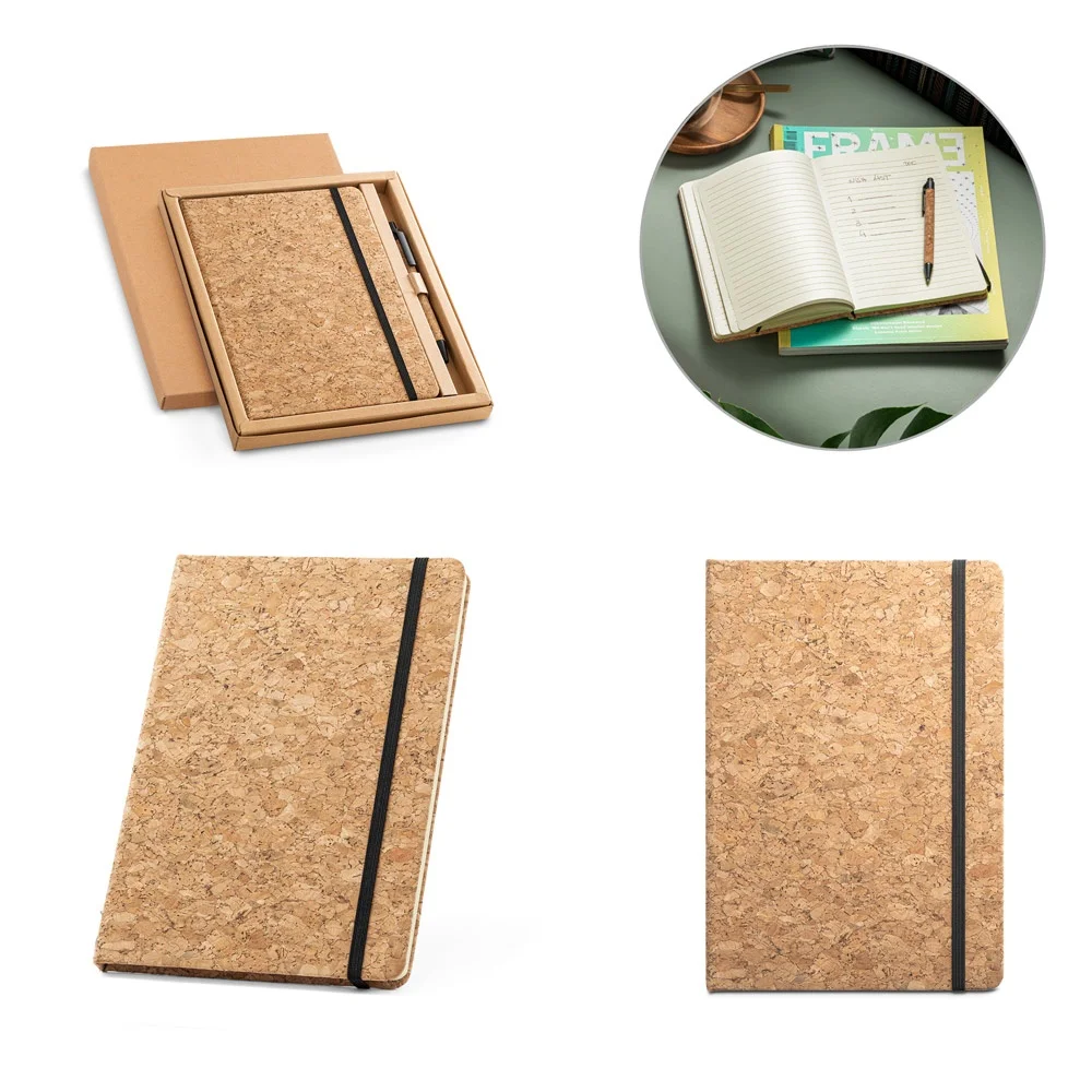 Conjunto de bloco de notas A5 e esferográfica em cortiça
