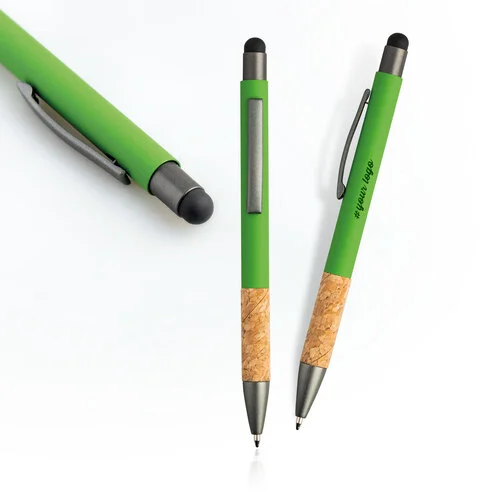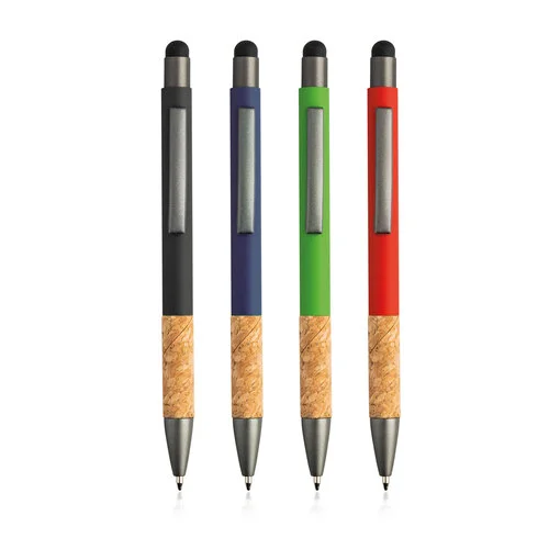 Esferográfica em aluminio e cortiça com acabamento de borracha e touch.