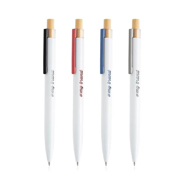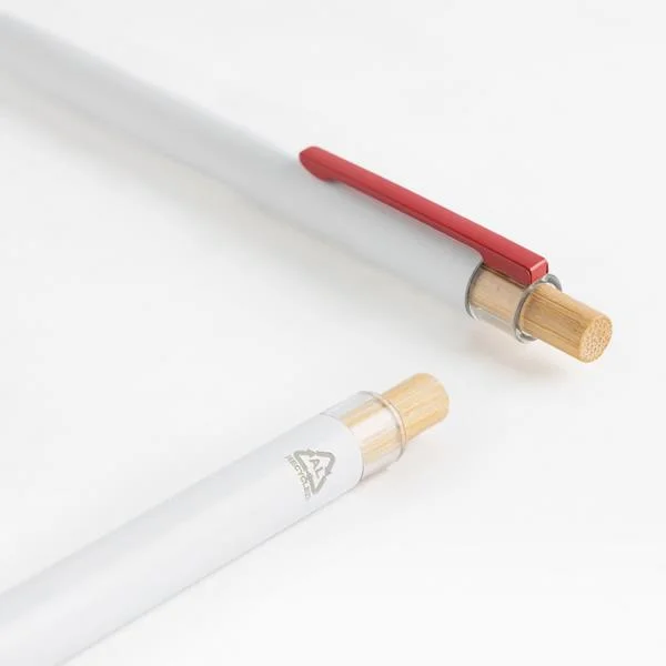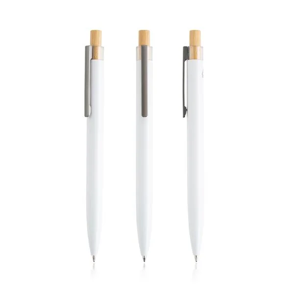 Esferográfica em alumínio reciclado com detalhe em bambu.