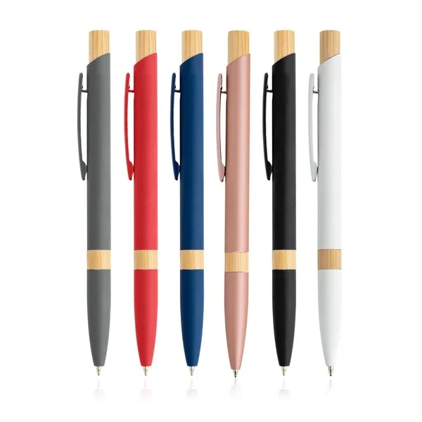 Esferográfica em alumínio reciclado, detalhes em bambu.