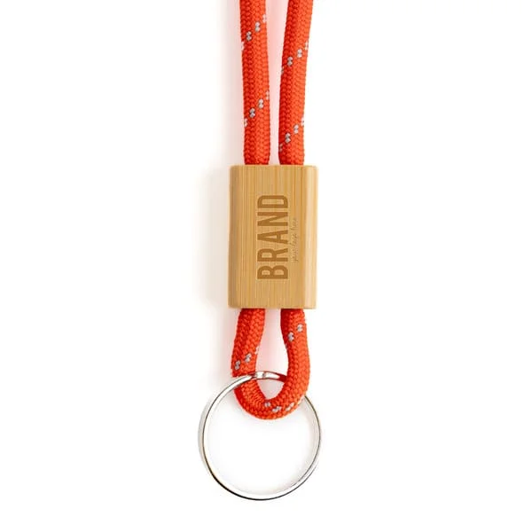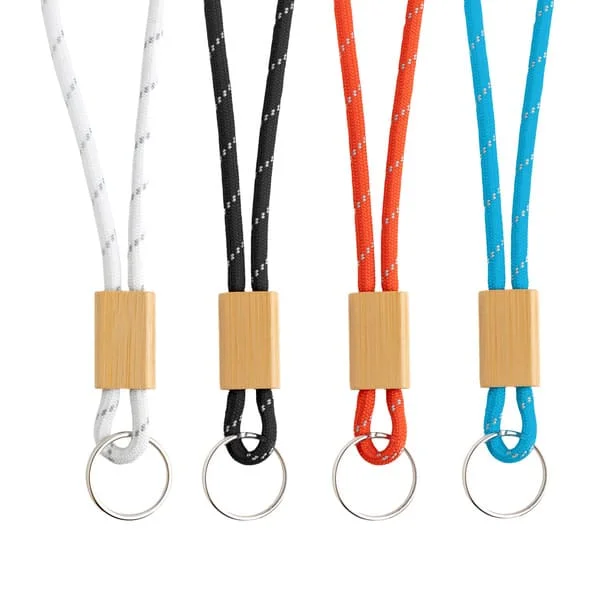 Porta-chaves tubular em poliéster, ajustável em bambu e mosquetão.